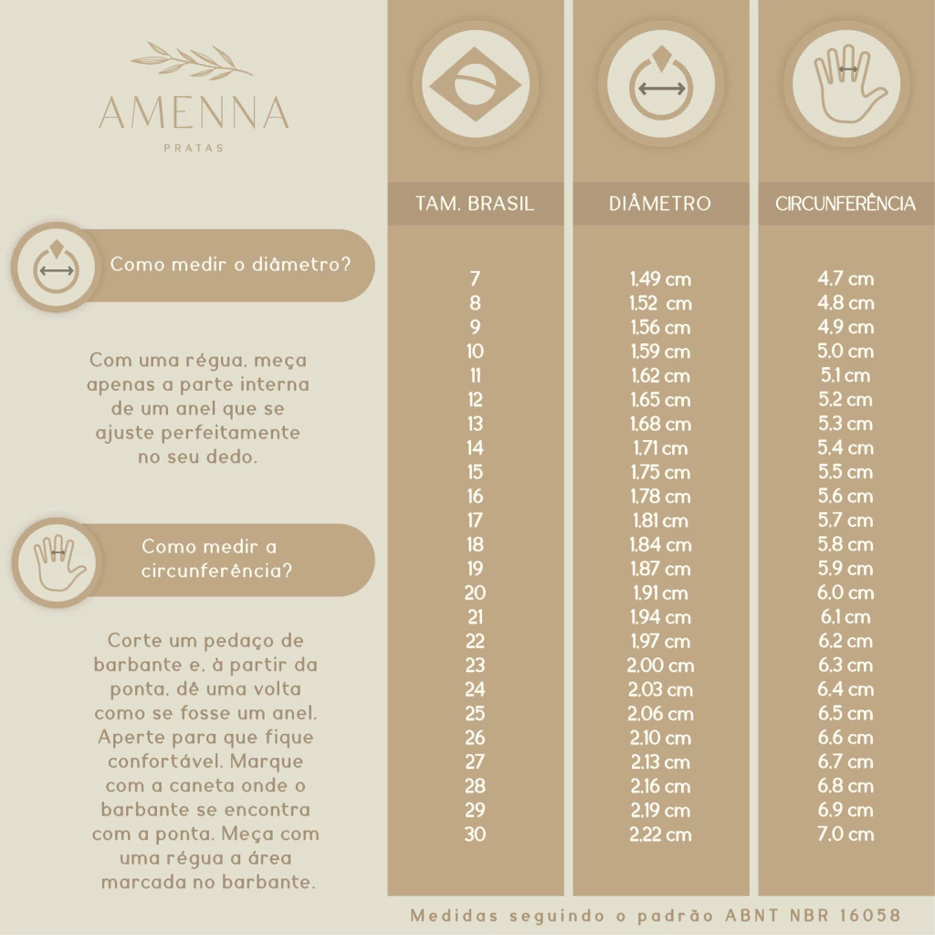 GUIA DE MEDIDAS: Antes de fechar o seu pedido, por favor, verifique a tabela de medidas de anéis na última foto do anúncio. Utilizamos a tabela oficial da ABNT, órgão oficial de padronização no Brasil. Sendo assim, as medidas convencionais/tradicionais antigas não serão mais utilizadas pela AMENNA PRATAS.