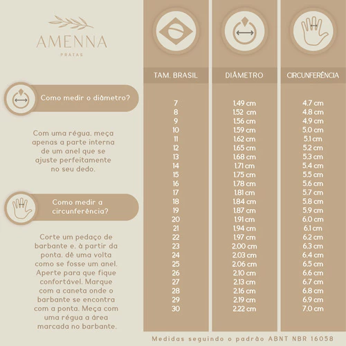 GUIA DE MEDIDAS: Antes de fechar o seu pedido, por favor, verifique a tabela de medidas de anéis na última foto do anúncio. Utilizamos a tabela oficial da ABNT, órgão oficial de padronização no Brasil. Sendo assim, as medidas convencionais/tradicionais antigas não serão mais utilizadas pela AMENNA PRATAS.