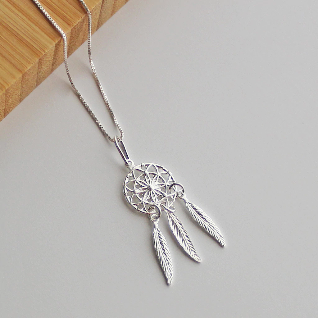 Colar com pingente em formato de filtro dos sonhos, símbolo tradicional de proteção e boas energias. O pingente apresenta um delicado trabalho vazado em forma de mandala floral, remetendo à teia dos filtros dos sonhos, e três penas finamente detalhadas pendem da base, conferindo leveza e movimento à peça. A corrente de elo fino realça a elegância do colar, tornando-o ideal para uso diário ou para complementar produções com um toque místico e boho. Uma joia que une significado, beleza e sofisticação em um só acessório.