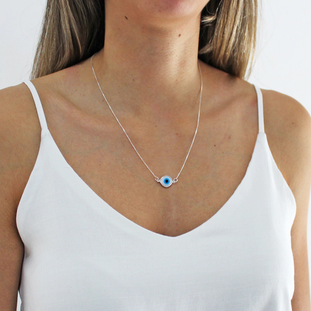 Proteção com estilo. Este colar delicado possui um pingente de olho grego – símbolo tradicional contra energias negativas. Com design minimalista e acabamento refinado, é perfeito para ser usado sozinho ou em combinações. Um amuleto moderno para quem busca equilíbrio, elegância e boas vibrações no dia a dia.