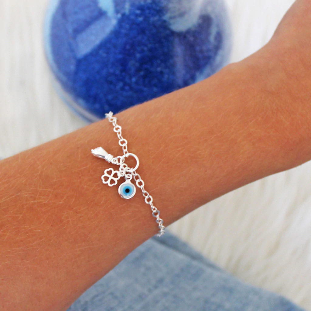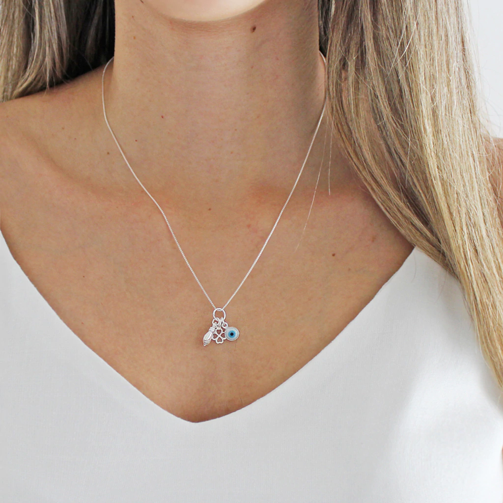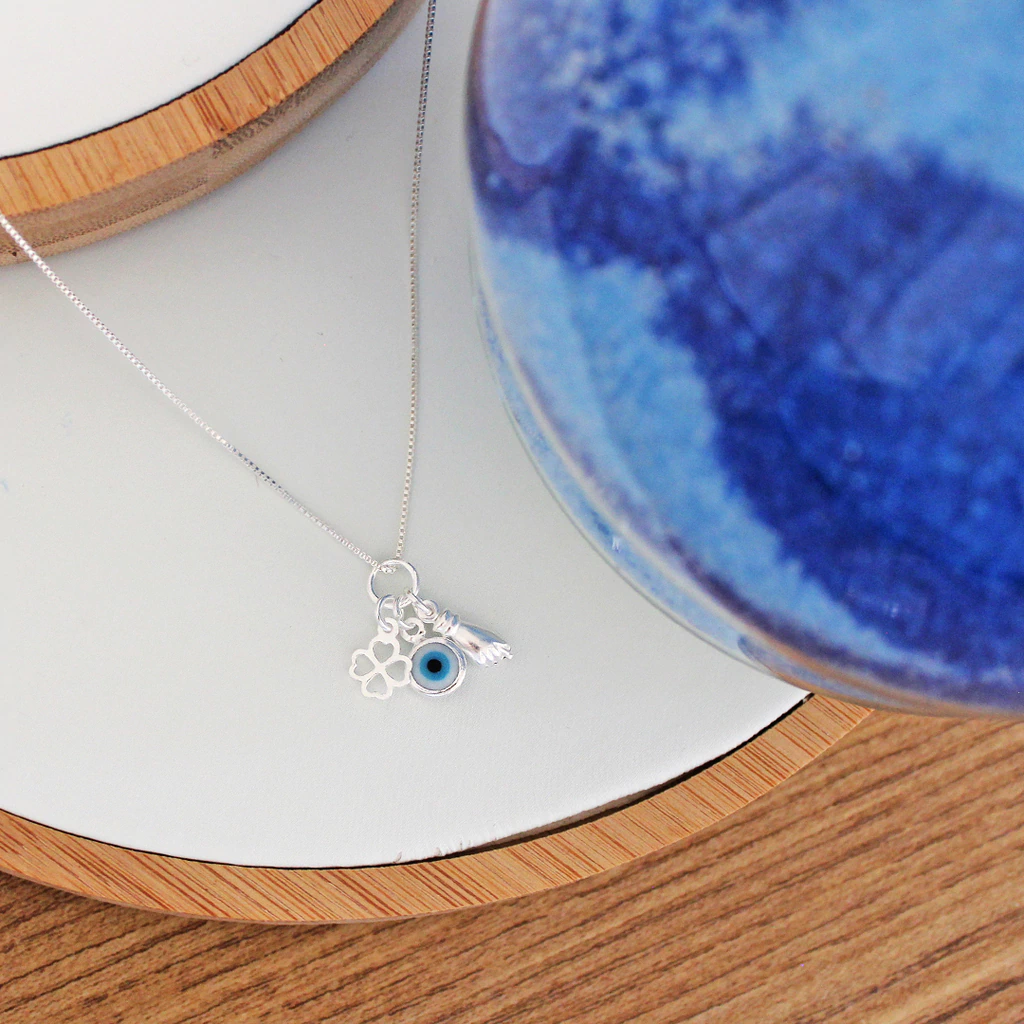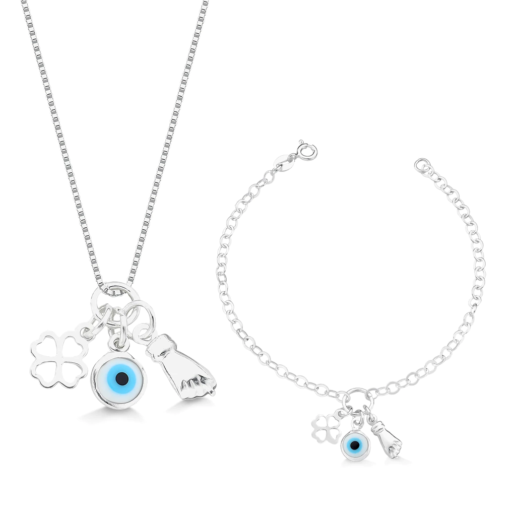 Joias delicadas e cheias de significado. As peças trazem três símbolos tradicionais: Olho Grego, que protege contra energias negativas; Figa, amuleto de sorte; e Trevo de Quatro Folhas, que simboliza fé e prosperidade. Um conjunto encantador, perfeito para presentear ou compor looks com estilo, proteção e boas energias.